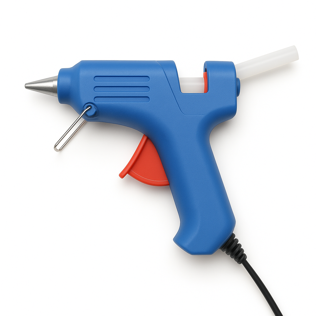 グルーガン とは、熱を使って材料を急速に接着するための道具です。ボタンや布、木材、プラスチックなど、さまざまな素材に対応することが多く、ホットボンドと呼ばれる棒状の接着剤を使用します。