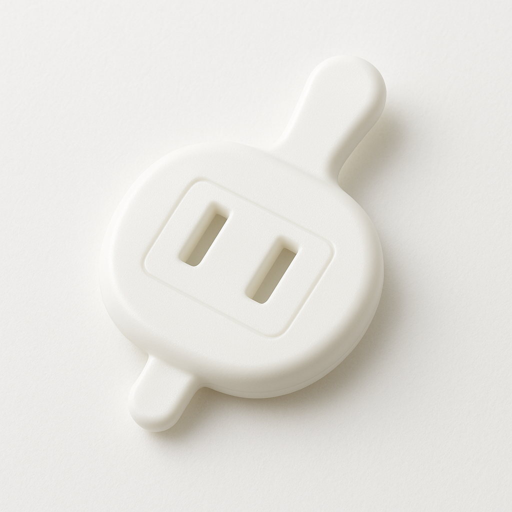 このコンセントキャップキーは、電源ソケットを覆う部品と、それを開けるための取り付け具(キー)をセットにした、安全関連の商品です。子どもが手を伸びして触れにくくする目的で使われます。