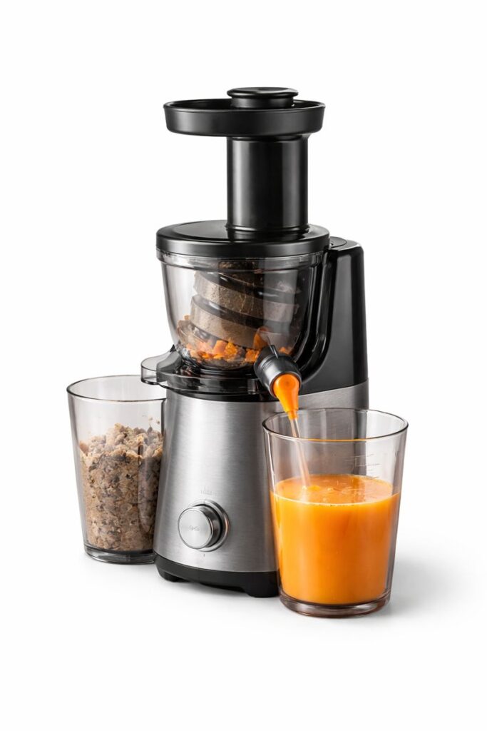本品は家庭用の電気機器として、果物や野菜の汁を抽出するための機械です。回転数を低く設定して搾汁を行うため、 スロージューサー と呼ばれます。高回転のジューサーと比べて空気との接触が少なく、栄養素の酸化を抑えやすいと説明されることがあります。