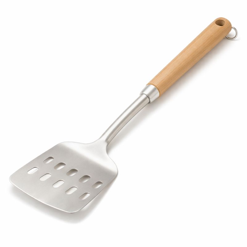 揚げ物や焼き物、炒め物などをひっくり返す際に、余分な液体を切り落としつつ作業できるため、油分を控えたい料理や脂の多い食材を扱う場面で重宝します。パンケーキ・野菜・卵料理・ウインナーなど、油分を伴うさまざまな場面で使用されます。